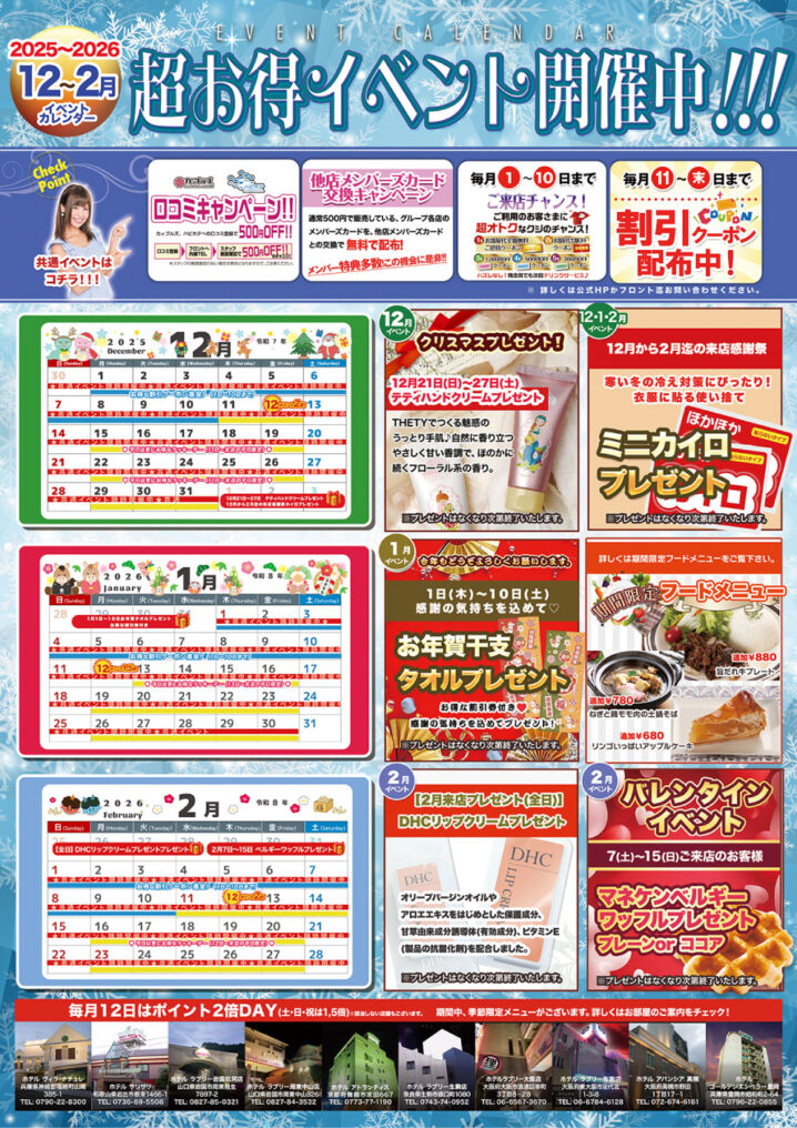 2025.12.01 News dreamparkhotels-resort_01 12月~2月合同イベントカレンダー更新 グループ共通の合同イベントカレンダー更新しました。 12月、1月、2月も随時イベントを開催しております。 是非、各ホテルをご利用ください。